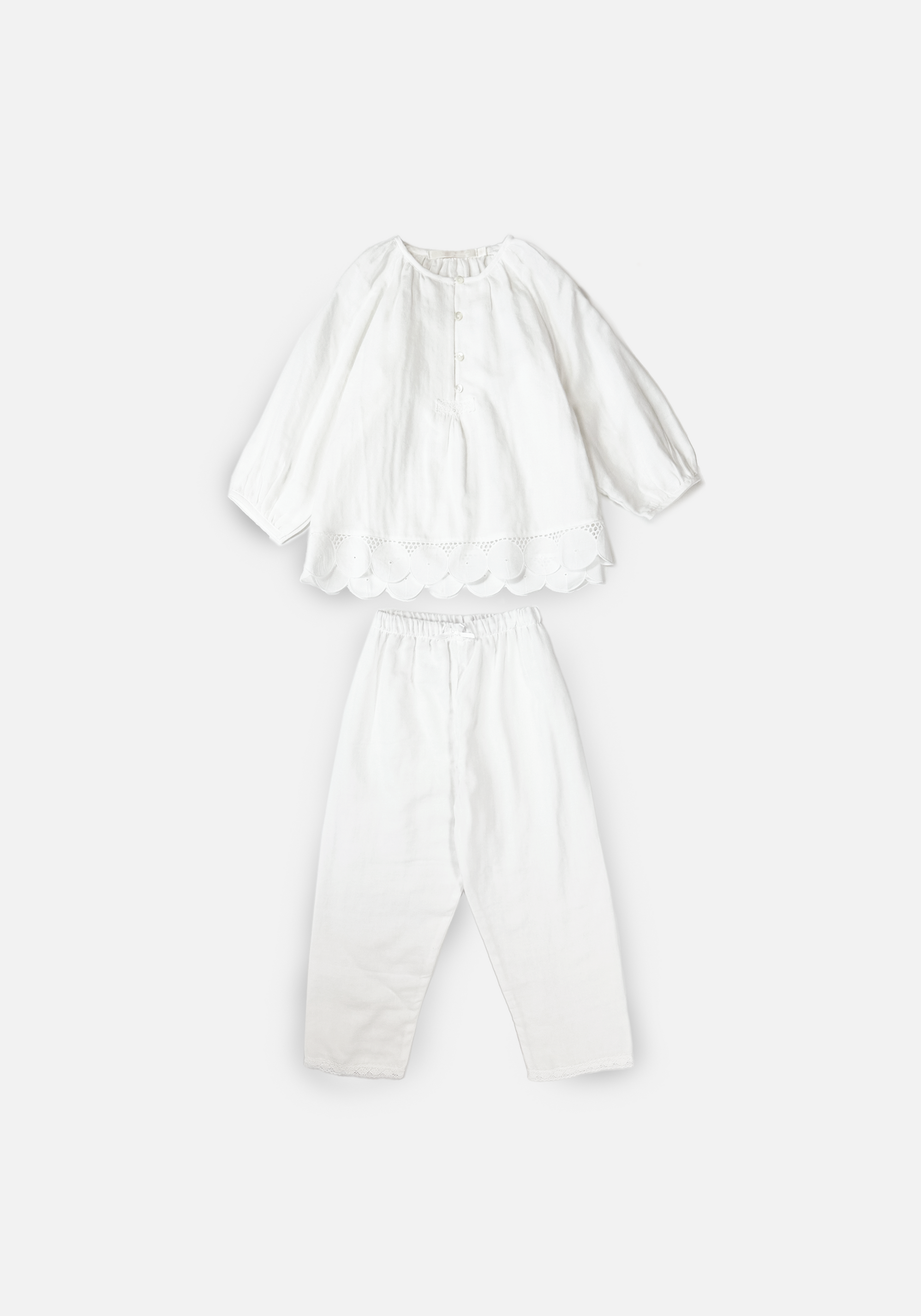 - Light weight cotton gauze set with cut out embroidery and scallop edge design